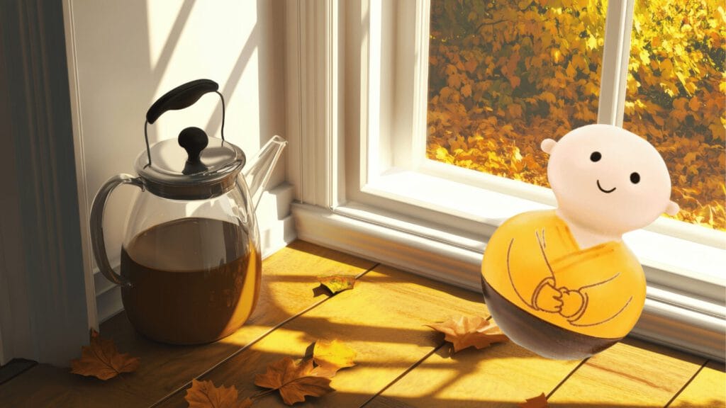 Lange schon hatte ich nach so einem Stehaufmännchen Ausschau gehalten, aber die grellbunten Plastikclowns oder Babyspielzeuge, die es zu kaufen gab, überzeugten mich nicht. Und dann fand ich IHN, ein kleines gelb gewandetes Zen-Mönchlein aus Buche und Walnuss, handbemalt, und so klein, dass er auf meine Handfläche passte – der perfekte Kandidat!
